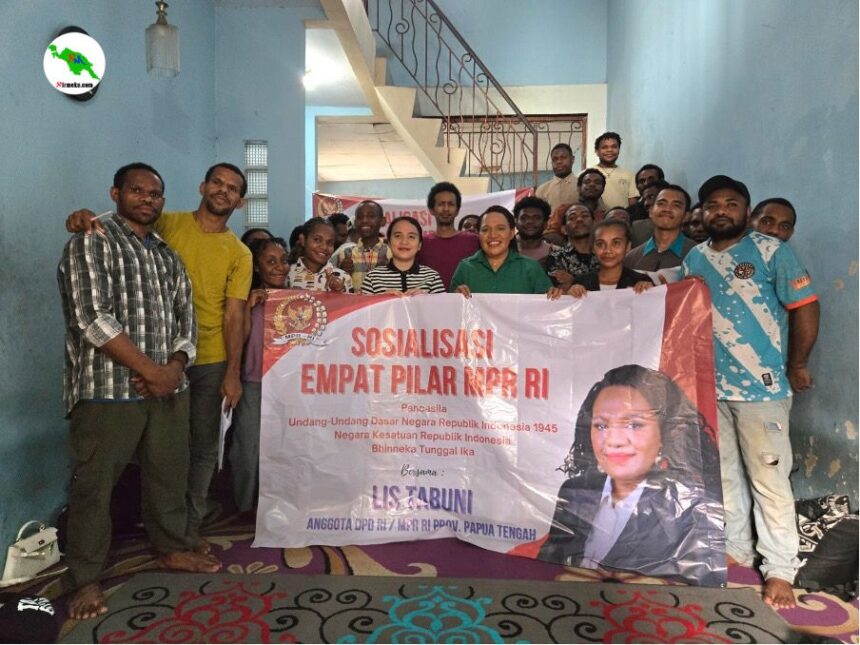 Nirmeke.com – Nabire, Papua Tengah – Anggota Dewan Perwakilan Daerah Republik Indonesia (DPD RI) sekaligus Anggota Majelis Permusyawaratan Rakyat Republik Indonesia (MPR RI), Lis Tabuni, menggelar kegiatan Sosialisasi Empat Pilar MPR RI kepada pelajar dan mahasiswa Lanny Jaya di Nabire. Kegiatan ini diikuti oleh Himpunan Pelajar Mahasiswa Kabupaten Lanny Jaya (HPMKLJ) dan dilaksanakan di Aula Mahasiswa Lanny, Jalan Kalibobo, Distrik Nabire, Provinsi Papua Tengah, Jumat, 12/12/2025.