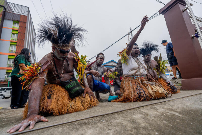 Sebelum memasuki gedung pengadilan, para penggugat menggelar doa dan ritual adat sebagai simbol duka atas kerusakan hutan dan tanah adat yang mereka alami. Tubuh mereka dilumuri lumpur putih sebagai tanda kehilangan dan perlawanan.